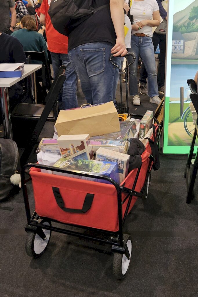 Leider gibt es immer noch eine Unsitte, die die Messeleitung noch zulässt: Große Rollkoffer, Bollerwagen und Kinderwagen. So gut wie immer war eine Stau-Ursache für volle Messegänge ein solches Gefährt. Warum man mit Säuglingen oder Kleinkindern auf eine Brettspielmesse geht, erschließt sich mir allerdings nicht wirklich…